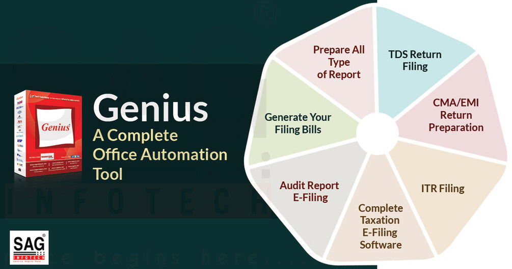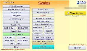 SAG Infotech's Genius tax return filing software stands out as a famous and comprehensive solution in the filed billing and taxation software for CA, CS and tax professionals. The software has been meeting the dynamic business requirements, of experts, and individuals, setting itself with its user-friendly interface, robust functionalities, and strict adherence to evolving regulatory standards. It has different kinds of software including Gen IT, Gen BAL, Gen TDS, Gen CMA, Form Manager etc.